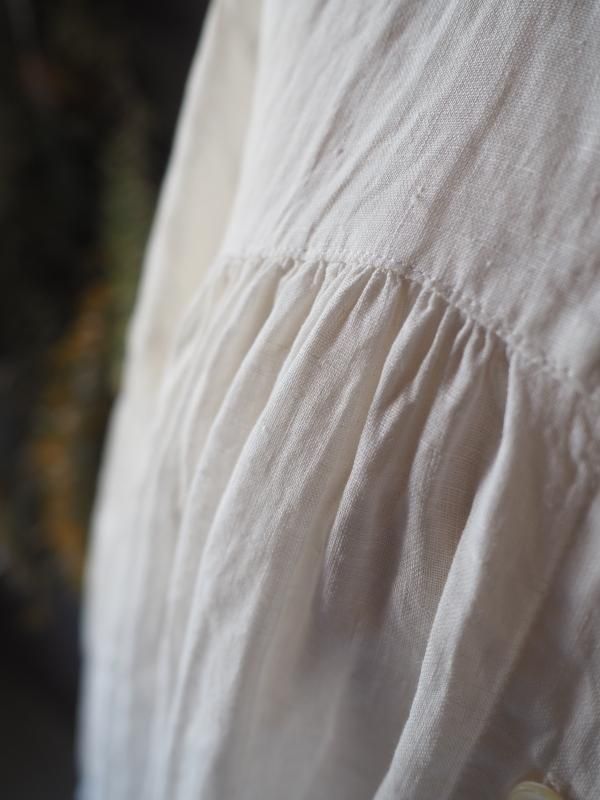 スタンドネックに、たっぷりのギャザーが入ったワンピースです。肩の部分も後ろ姿もたっぷりギャザーで、どの角度からも美しいとドレープです。