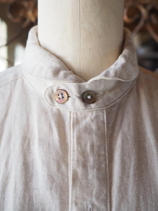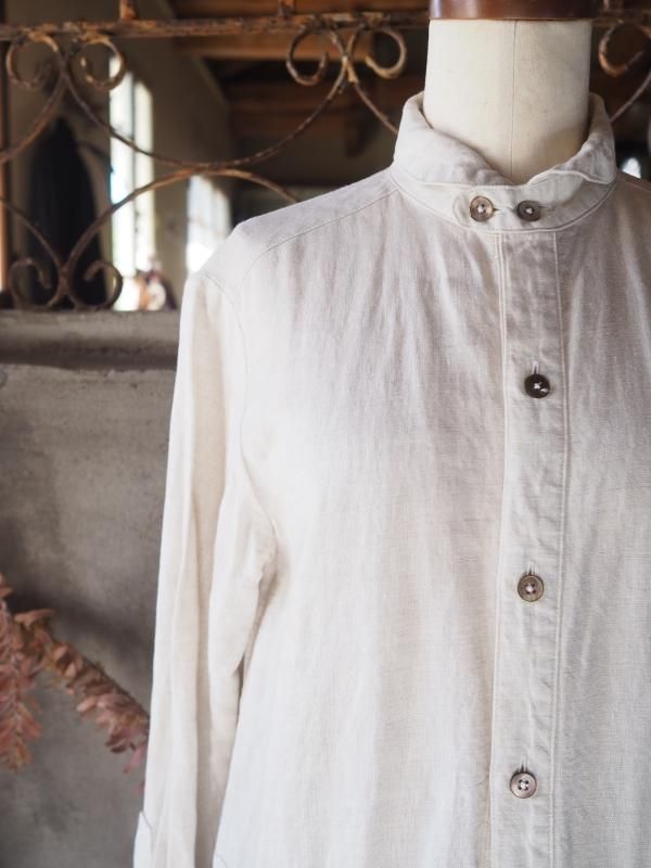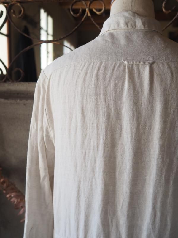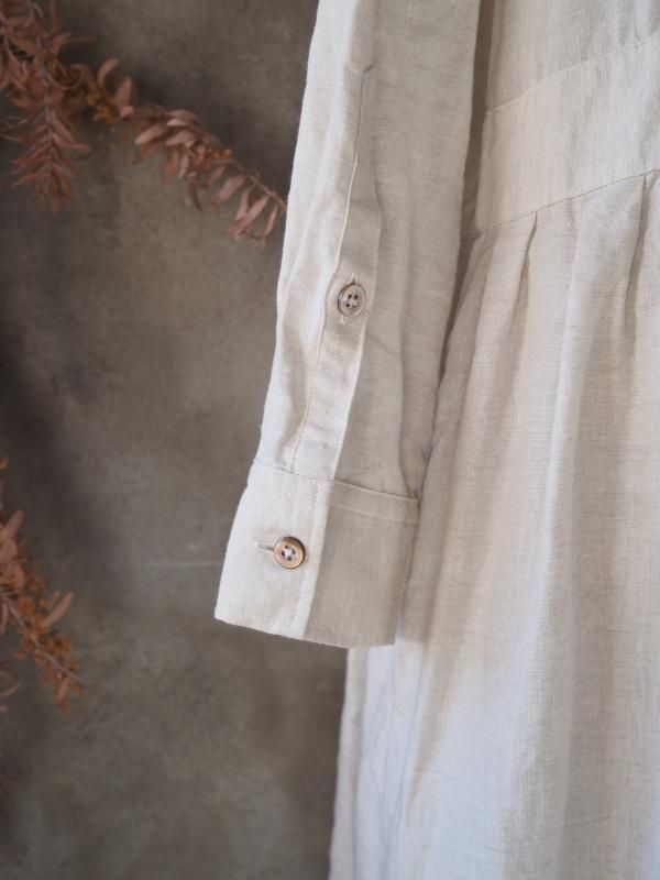 こちらは、優しい色合いのナチュラルカラー。リネン定番の色合いは、コーディネートしやすいです。透け感を感じますが、軽やかな厚みは長い期間出番があり、コートとして羽織るにも最適です◎