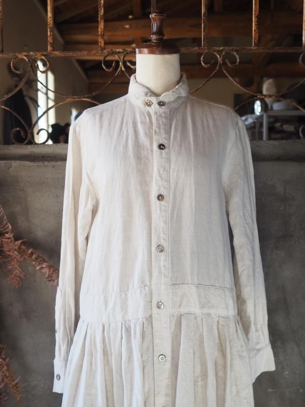 コンパクトでまあるく小さな襟のワンピースです。スッキリとブラウス感覚のトップに、腰で切り替えのタック。
