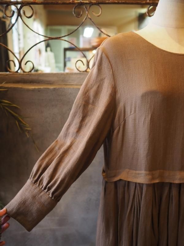 すっきりとしたラウンドネックにダブルタックのプリーツスカートのクラシカルなラインのワンピースです。袖口にはたっぷりとしたギャザーに5つのくるみボタン。
