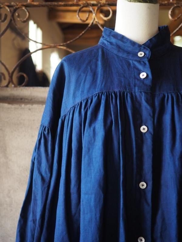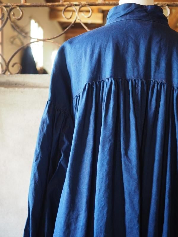 スタンドネックに、たっぷりのギャザーが入ったワンピースです。肩の部分も後ろ姿もたっぷりギャザーで、どの角度からも美しいとドレープです。