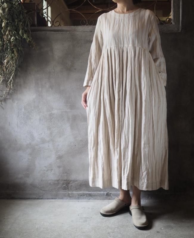 スッキリとしたラウンドネックに、少しハイウエストな切り替え。スカート部分は細かなタックで仕上げていますのでボリュームが出ず、大人っぽいラインのワンピースです。