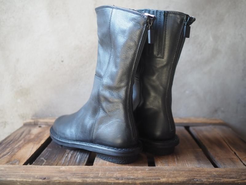 trippenお馴染みのラバーを使用したアウトソールで、歩行時の衝撃を和らげる機能性の高い一足に。 バックがジップタイプで、足を優しくホールドします。素材には植物タンニンなめしの柔らかな牛革を使用しており、履きこむ程に柔らかくなり、増していく風合いも魅力的です。 トレンドのボリューム感のあるスカートやパンツスタイルから、デニム、テーパードパンツなど、様々なボトムスとのコーディネートを楽しめます。