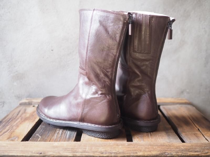 trippenお馴染みのラバーを使用したアウトソールで、歩行時の衝撃を和らげる機能性の高い一足に。 バックがジップタイプで、足を優しくホールドします。素材には植物タンニンなめしの柔らかな牛革を使用しており、履きこむ程に柔らかくなり、増していく風合いも魅力的です。 トレンドのボリューム感のあるスカートやパンツスタイルから、デニム、テーパードパンツなど、様々なボトムスとのコーディネートを楽しめます。