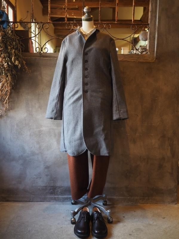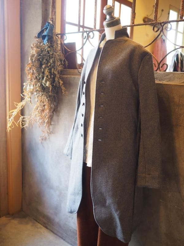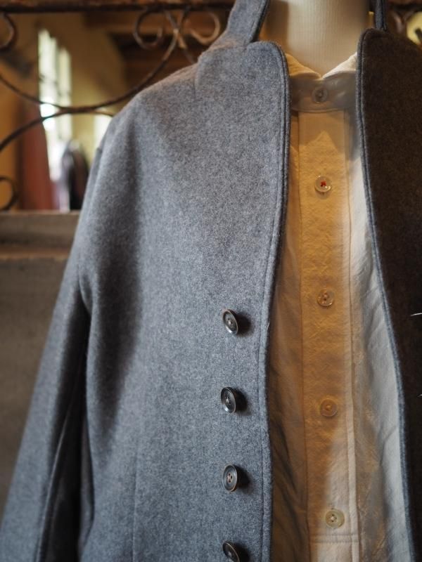 キリッとした小さな衿に、たくさんの水牛ボタンが並んでいるフランス風なコートです。こちらは、Men'sサイズです。