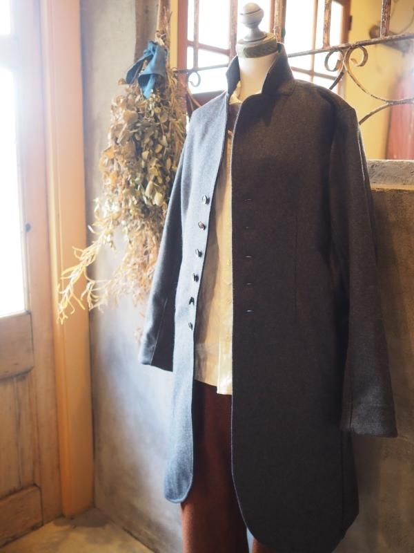 キリッとした小さな衿に、たくさんの水牛ボタンが並んでいるフランス風なコートです。こちらは、Men'sサイズです。