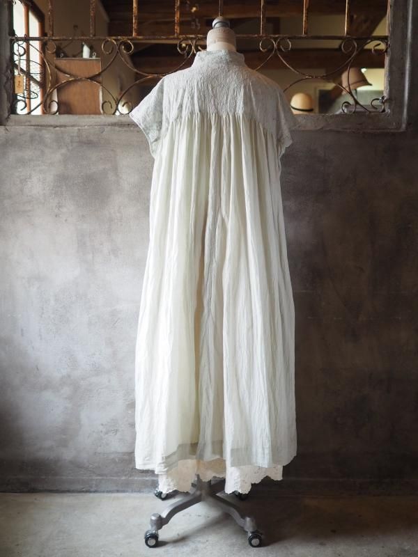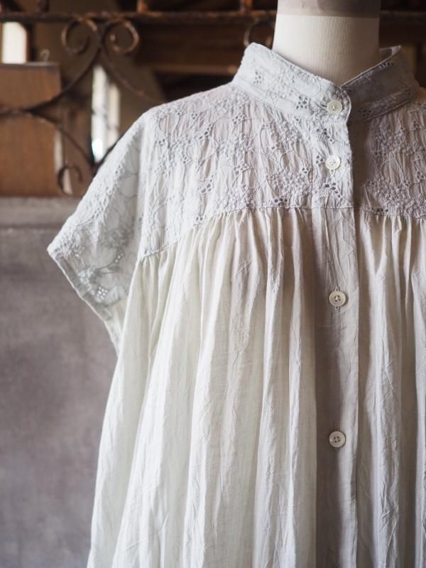 こちらは透明感あるふわふわのハンドワッシャーコットンセージカラー。肩の部分は、同じ素材の上質な刺繍生地。落ち着きある一枚です。