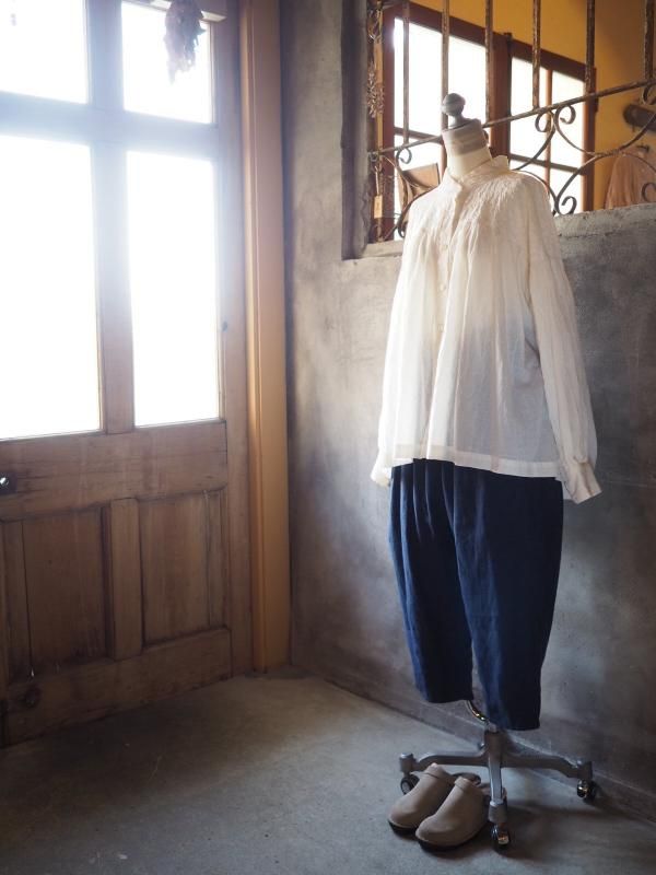 男女兼用のコクーンラインパンツです。たっぷりとしたヒップ幅は、まあるい形でもダボつかず、足首に向けてすっきりと履いていただけます。