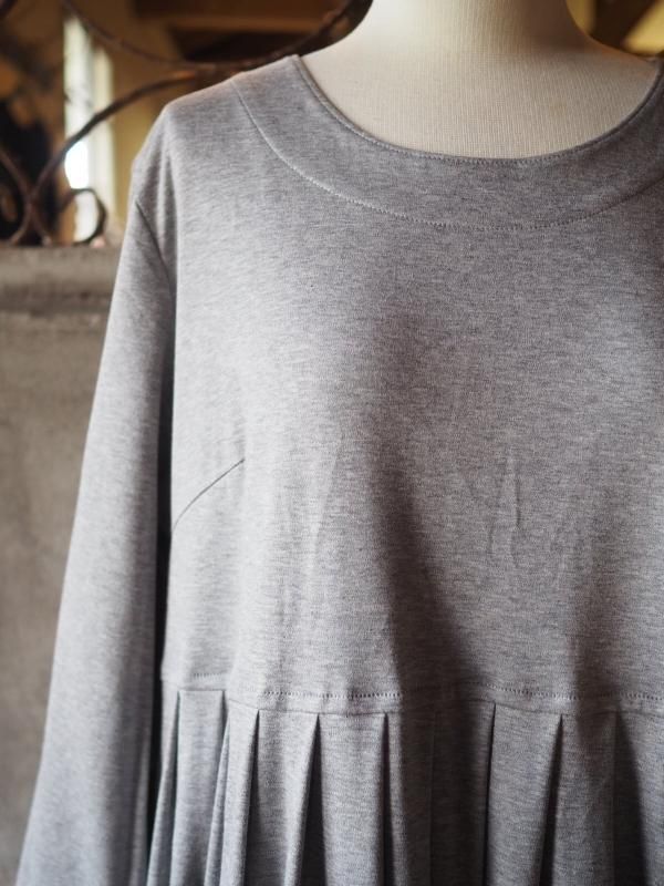 スッキリとしたラウンドネックに、少しハイウエストな切り替え。スカート部分は細かなタックで仕上げていますのでボリュームが出ず、大人っぽいラインのワンピースです。