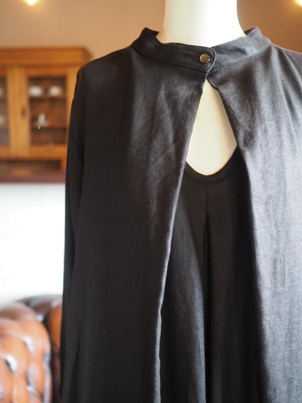 前後で着ることができるワンピースです。首周りは、ゆるりとスタンドネックで仕上げました。