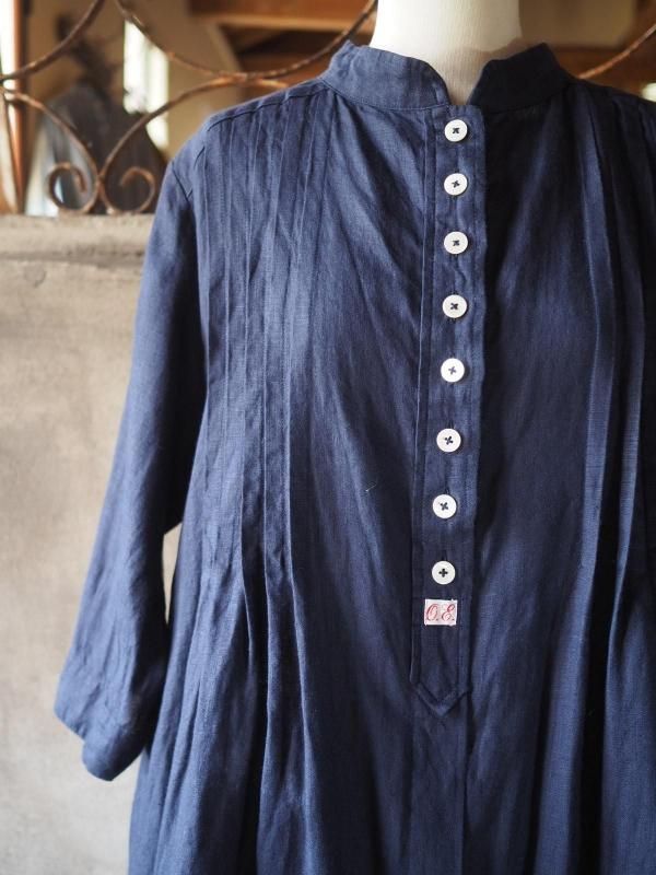 襟元をカバーしてくれるスタンドネックのすっきりとしたワンピースです。胸元にあるピンタックが縦のラインを作ってくれ身幅をコンパクトに見せてくれます。