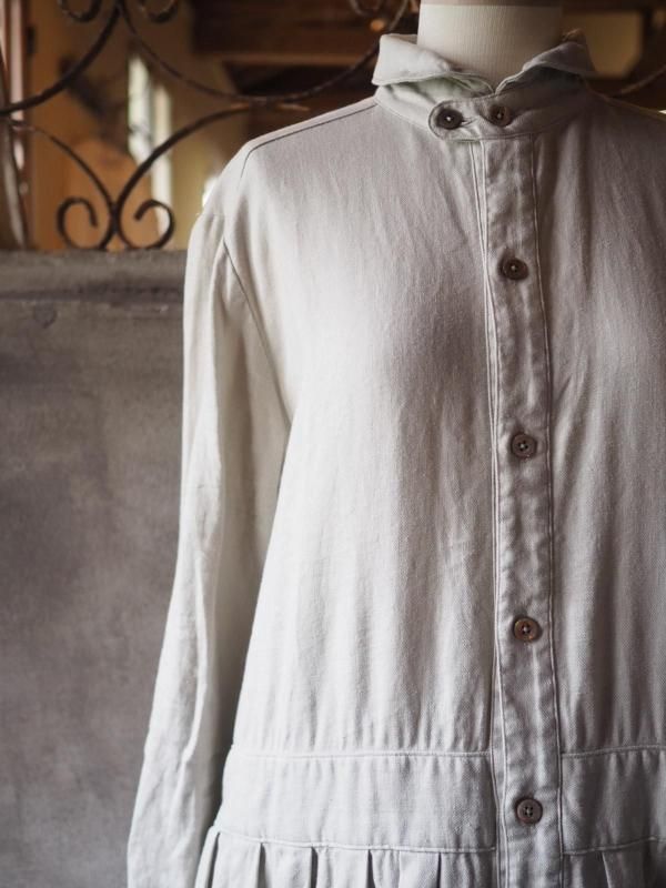 コンパクトでまあるく小さな襟のワンピースです。スッキリとブラウス感覚のトップに、腰で切り替えのタック。