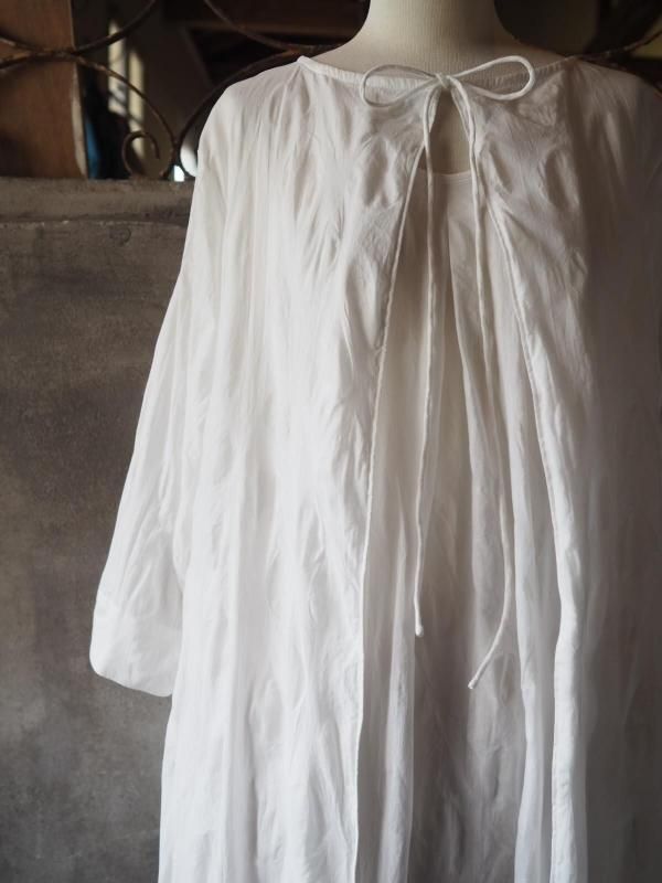 細く流れるようなリボンが印象的な前後ワンピースです。リボンで結ぶ方は、タック仕上げにしているので、すっきりとしながらもゆとりあるデザインです。襟元を見せつつ隠す、上品なラウンドカラー。