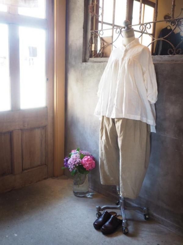 男女兼用のコクーンラインパンツです。たっぷりとしたヒップ幅は、まあるい形でもダボつかず、足首に向けてすっきりと履いていただけます。