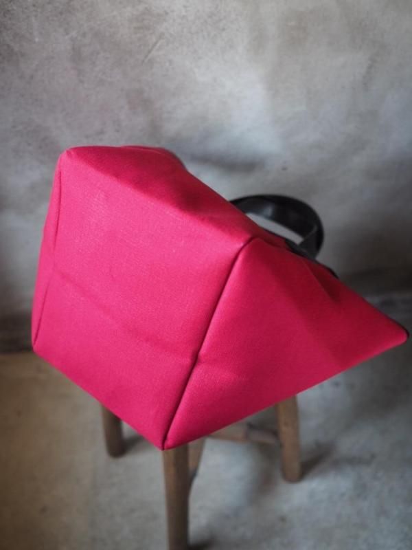 四角い底から台形に広がるすっきりとシンプルなフォルムのバッグ。正方形の底面は安定感あり、小ぶりながらたっぷりとした容量です。