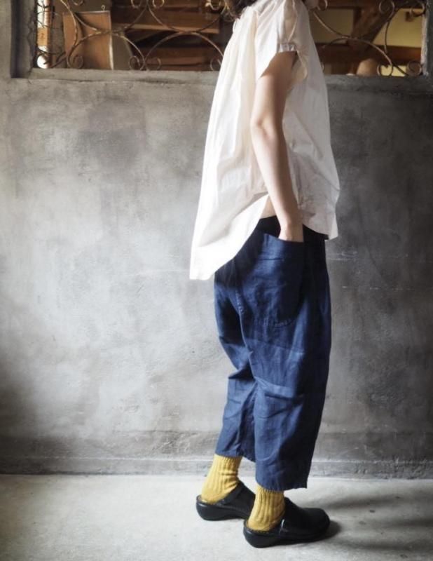 男女兼用のコクーンラインパンツです。たっぷりとしたヒップ幅は、まあるい形でもダボつかず、足首に向けてすっきりと履いていただけます。