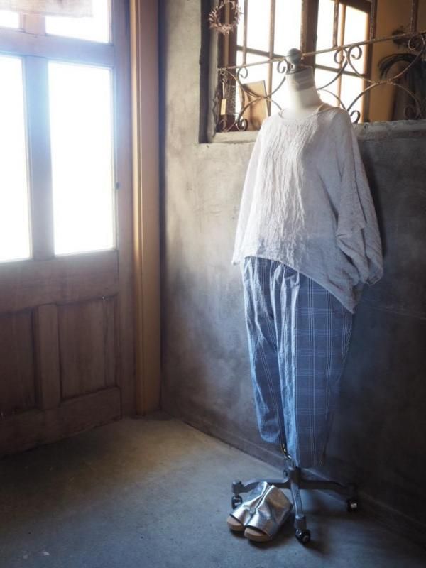 男女兼用のコクーンラインパンツです。たっぷりとしたヒップ幅は、まあるい形でもダボつかず、足首に向けてすっきりと履いていただけます。
