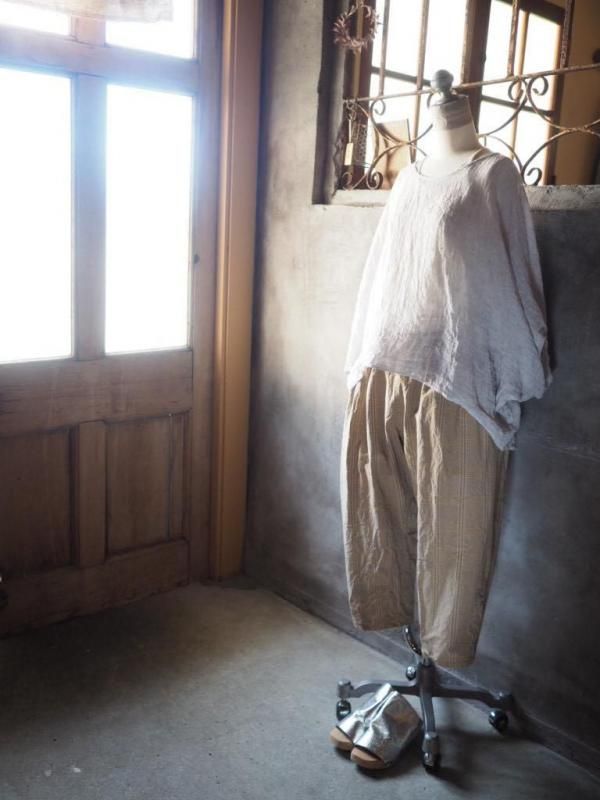 男女兼用のコクーンラインパンツです。たっぷりとしたヒップ幅は、まあるい形でもダボつかず、足首に向けてすっきりと履いていただけます。
