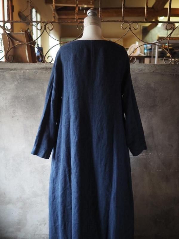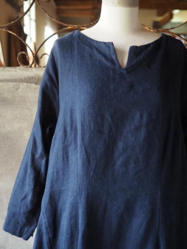 コンパクトな襟ぐりながら、脱ぎ着がしやすいようにスリットを付けて、すっきりとした印象にしています。Aラインに広がるワンピースのラインに、両サイドにプリーツを付けてみました。