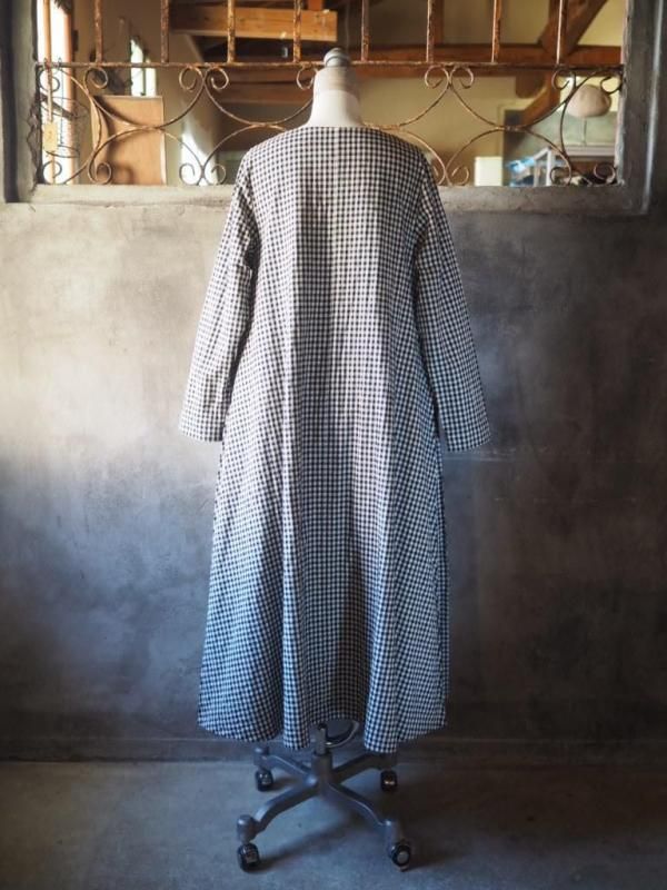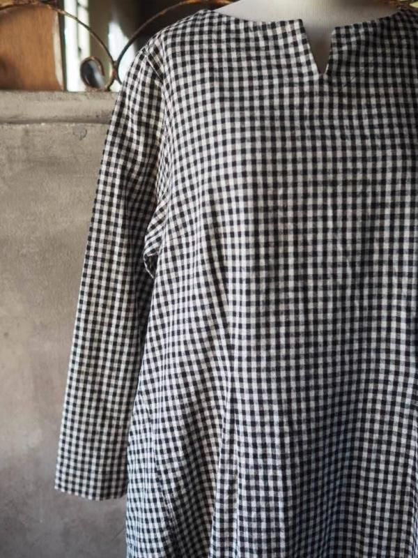 コンパクトな襟ぐりながら、脱ぎ着がしやすいようにスリットを付けて、すっきりとした印象にしています。Aラインに広がるワンピースのラインに、両サイドにプリーツを付けてみました。