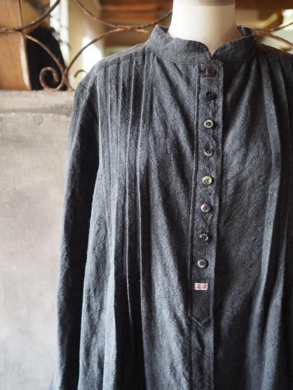 襟元をカバーしてくれるスタンドネックのすっきりとしたワンピースです。胸元にあるピンタックが縦のラインを作ってくれ身幅をコンパクトに見せてくれます。