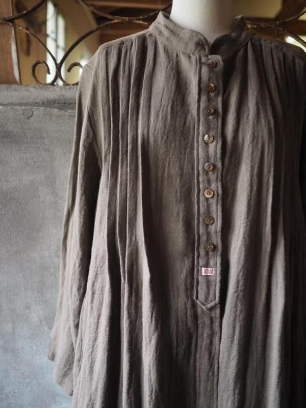 スタンドネックピンタックワンピース長袖 リネンビエラモカ
