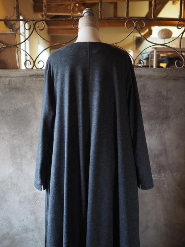 コンパクトな襟ぐりながら、脱ぎ着がしやすいようにスリットを付けて、すっきりとした印象にしています。Aラインに広がるワンピースのラインに、両サイドにプリーツを付けてみました。