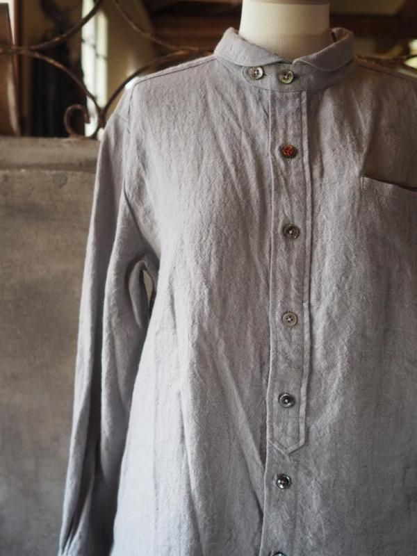 Sa-Rah定番のシャツです。ボタンが二つ並んだコンパクトな襟は、立てて着ることも出来ます。