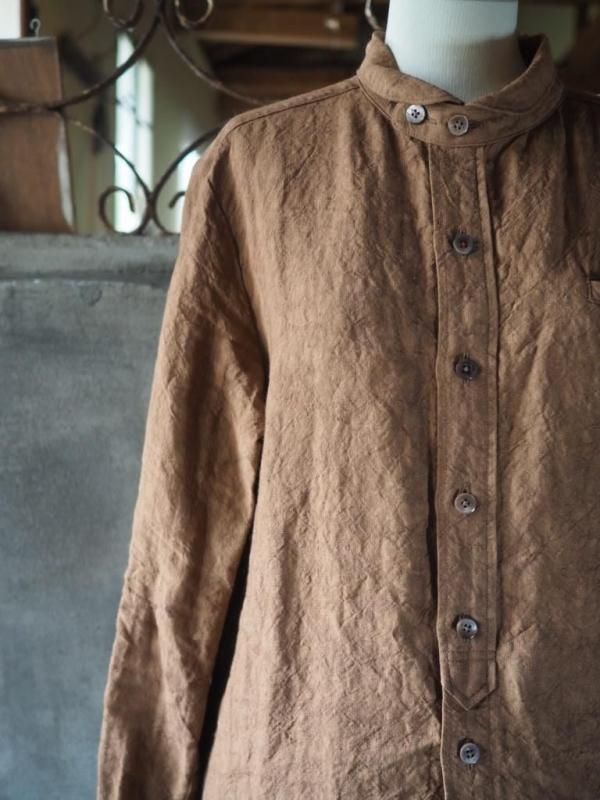 Sa-Rah定番のシャツです。ボタンが二つ並んだコンパクトな襟は、立てて着ることも出来ます。